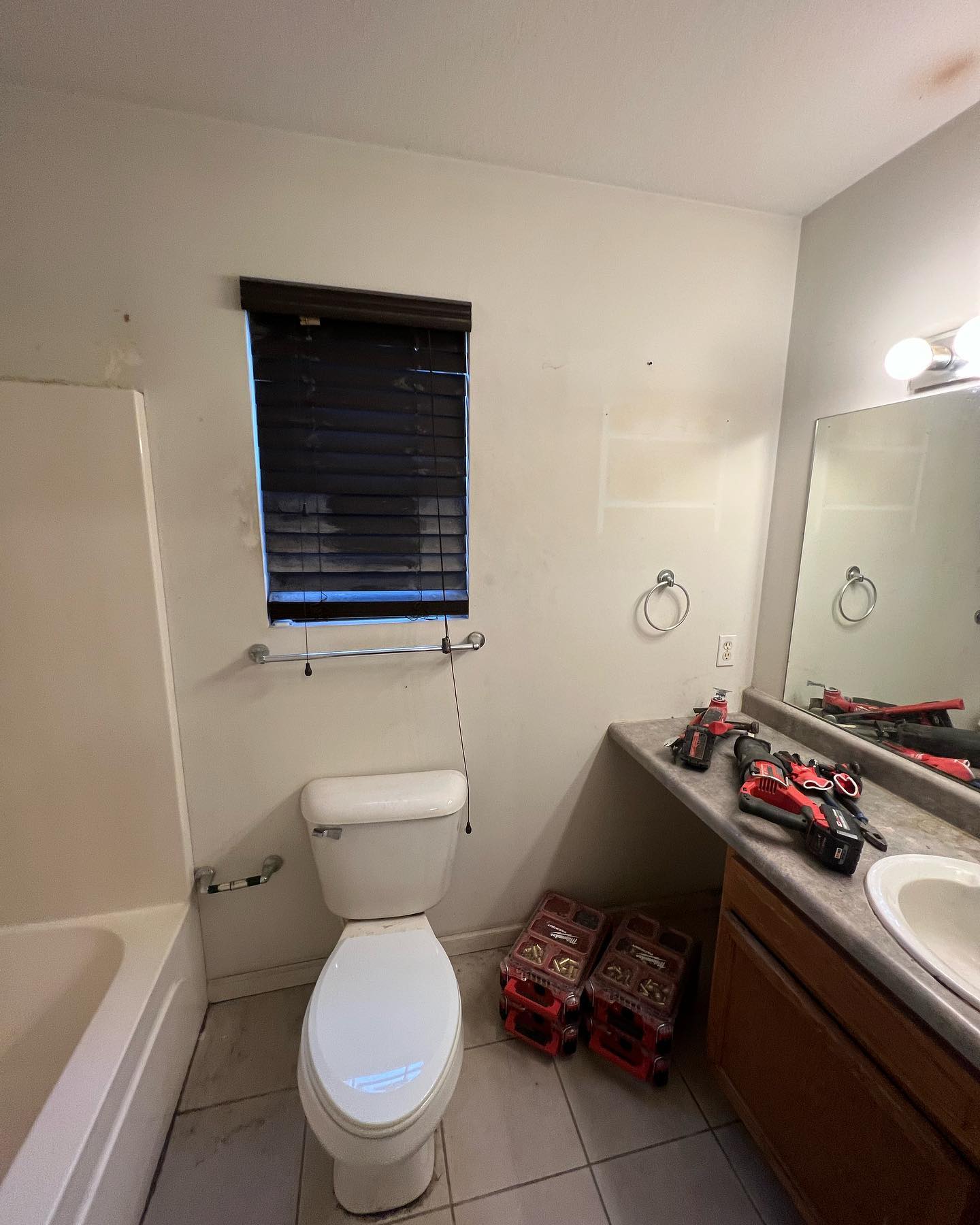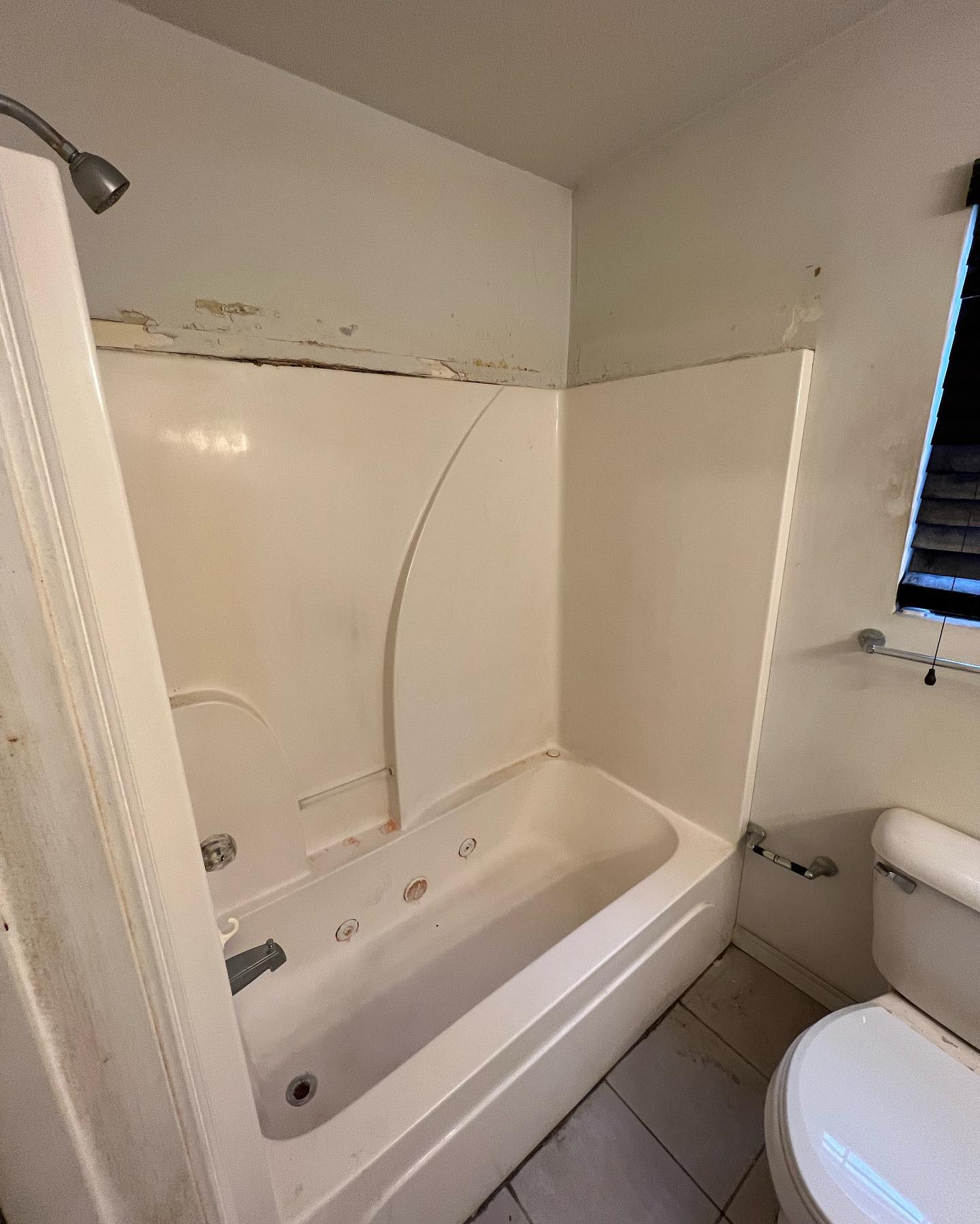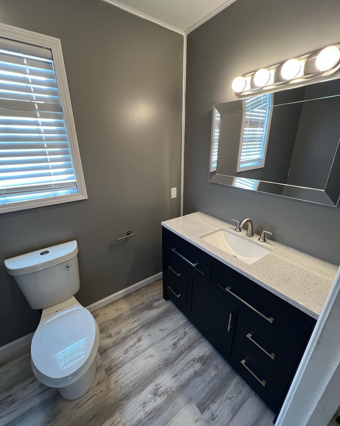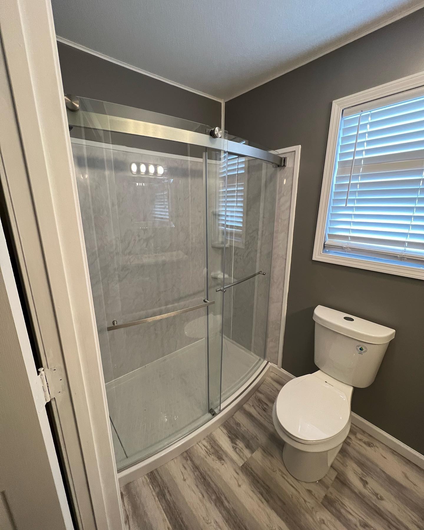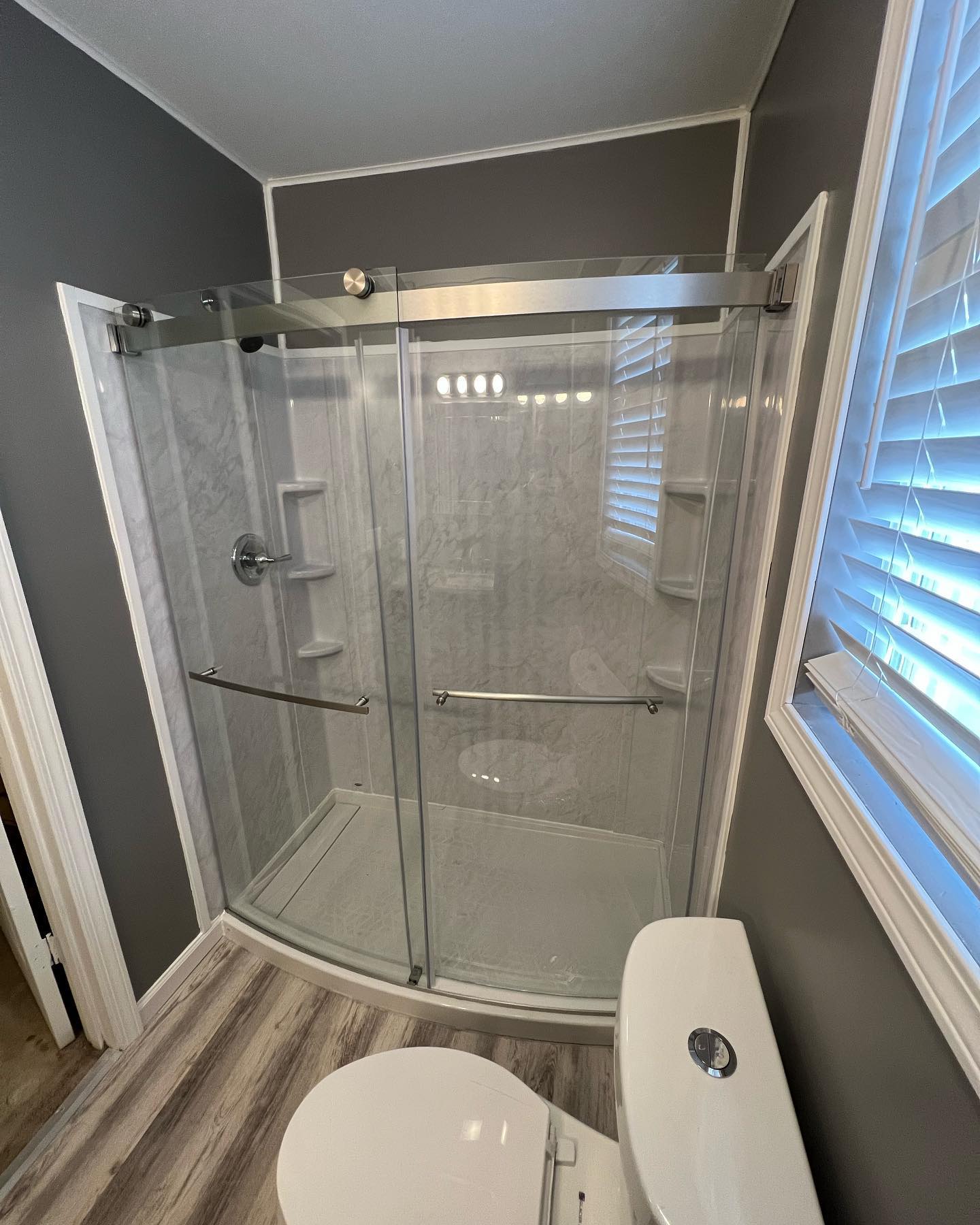 Here’s a full bathroom remodel from floor to ceiling. Installed new flooring, a new vanity, a shower with a sliding glass door, a new toilet and then finished it all of with fresh paint and new trim.