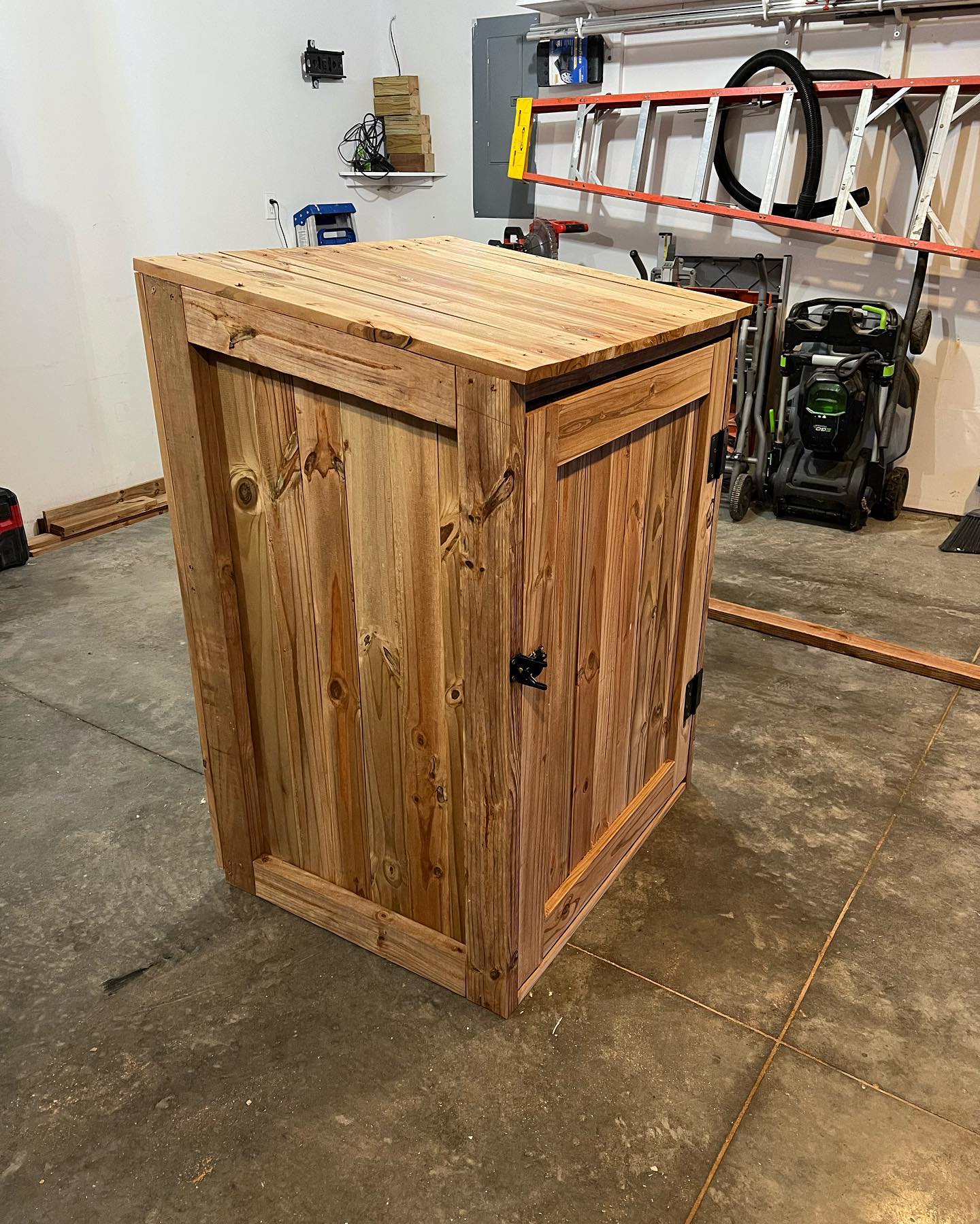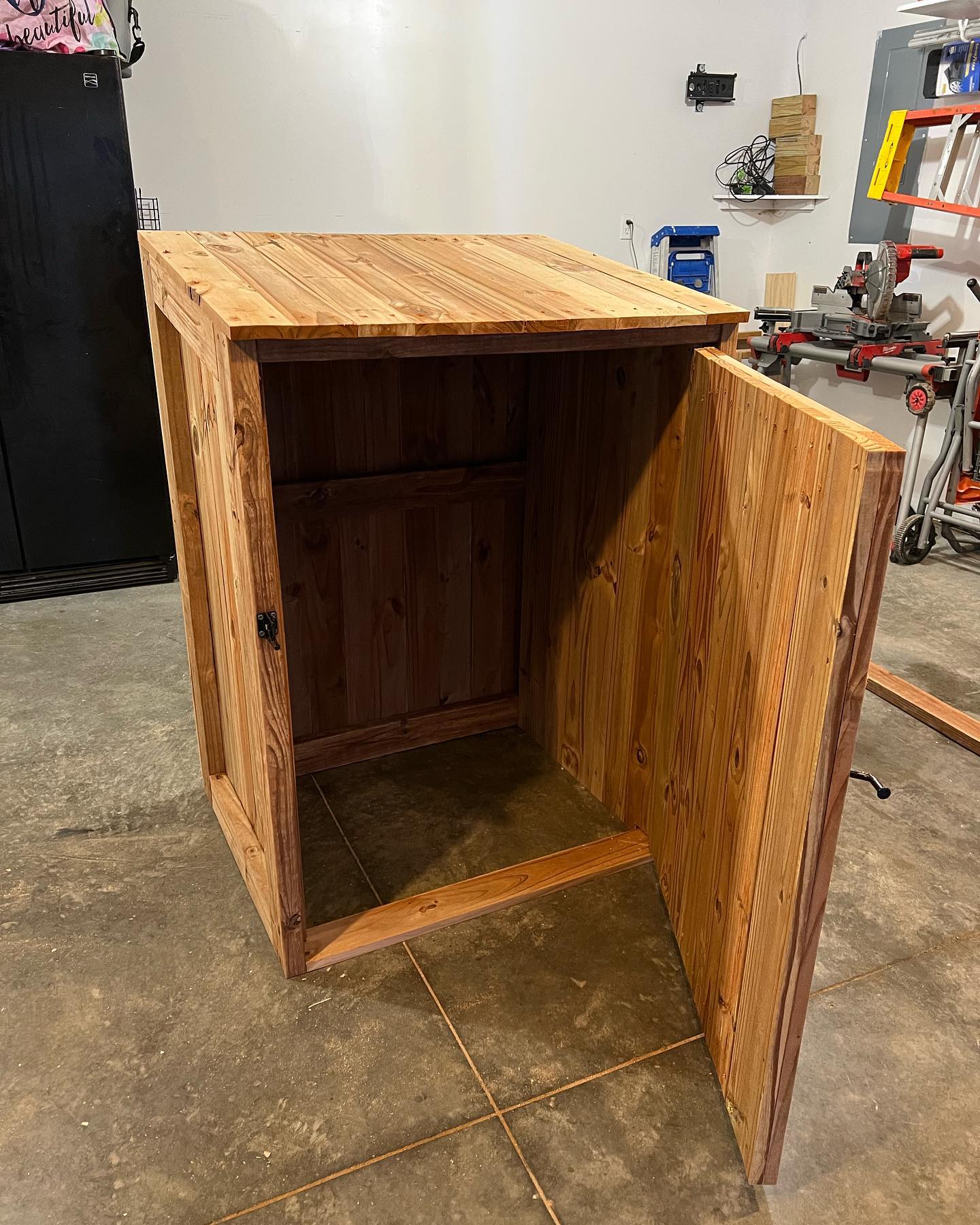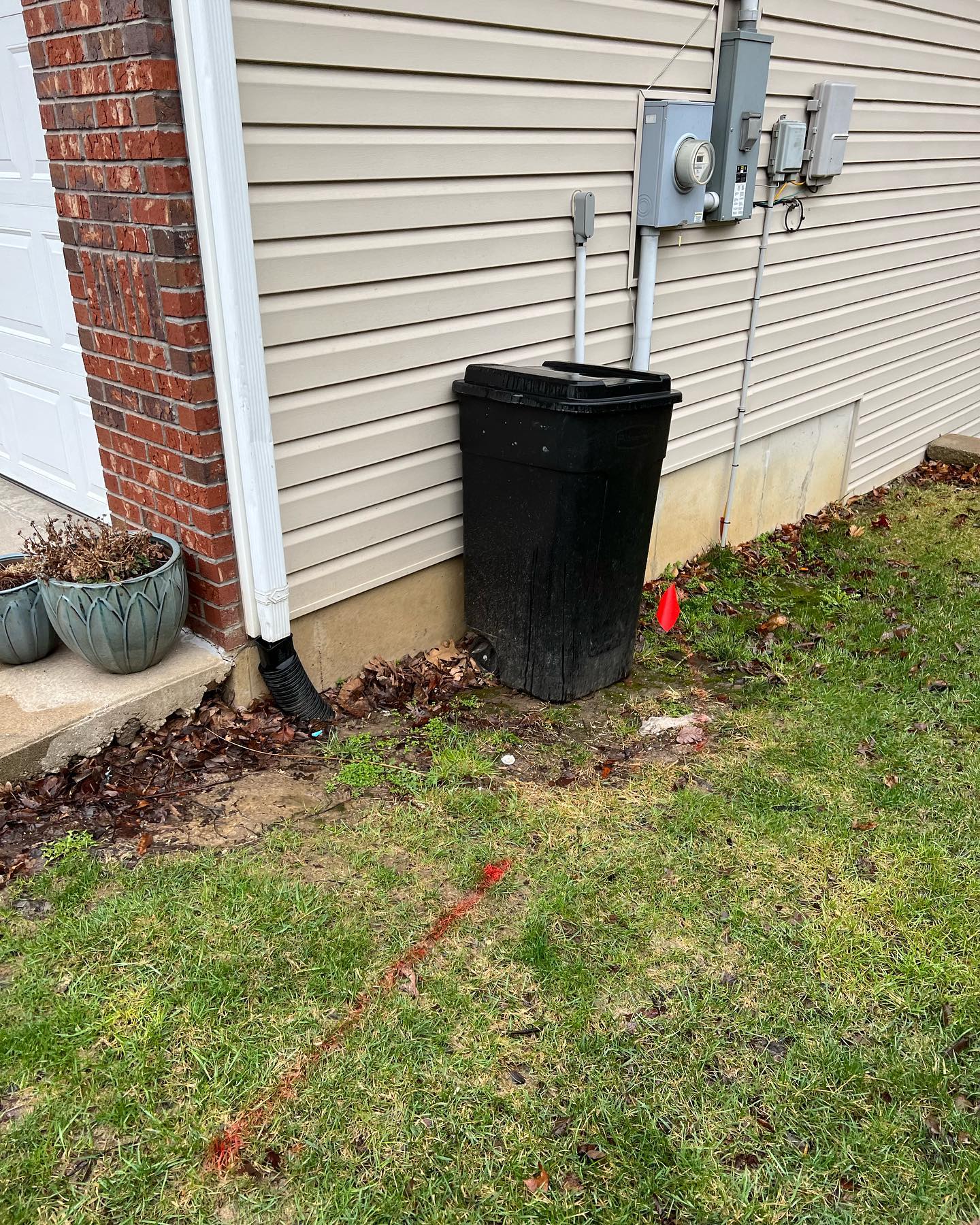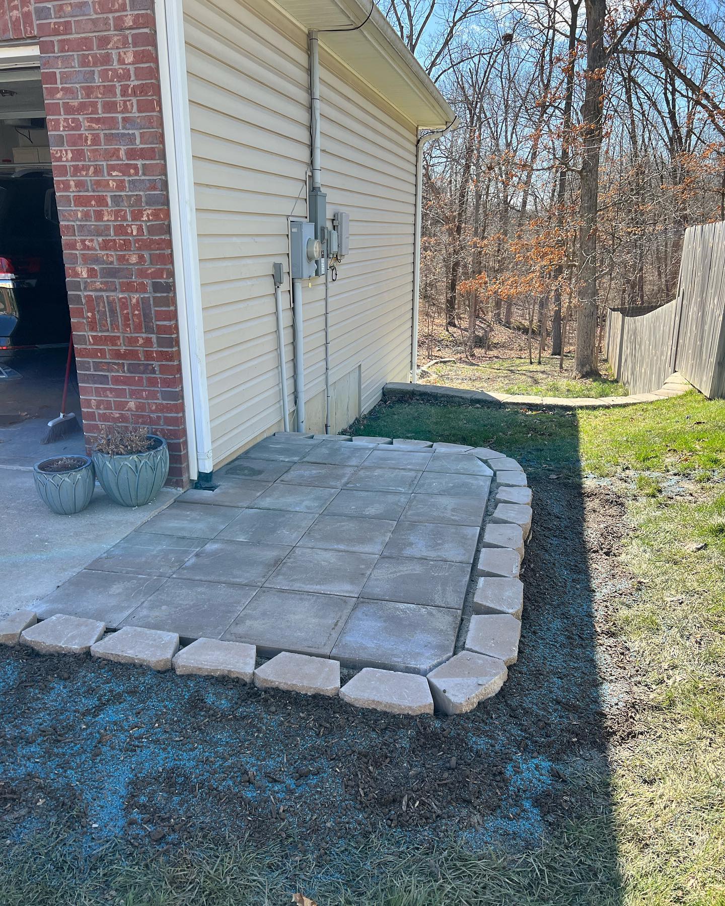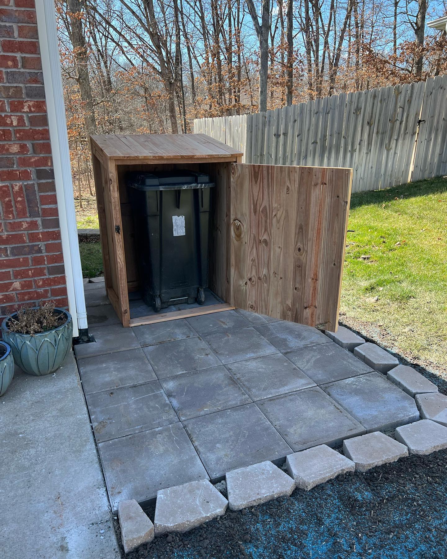 Before and after of a custom trash can cover and patio. No more getting muddy while putting the trash outside, and it improves curb appeal!