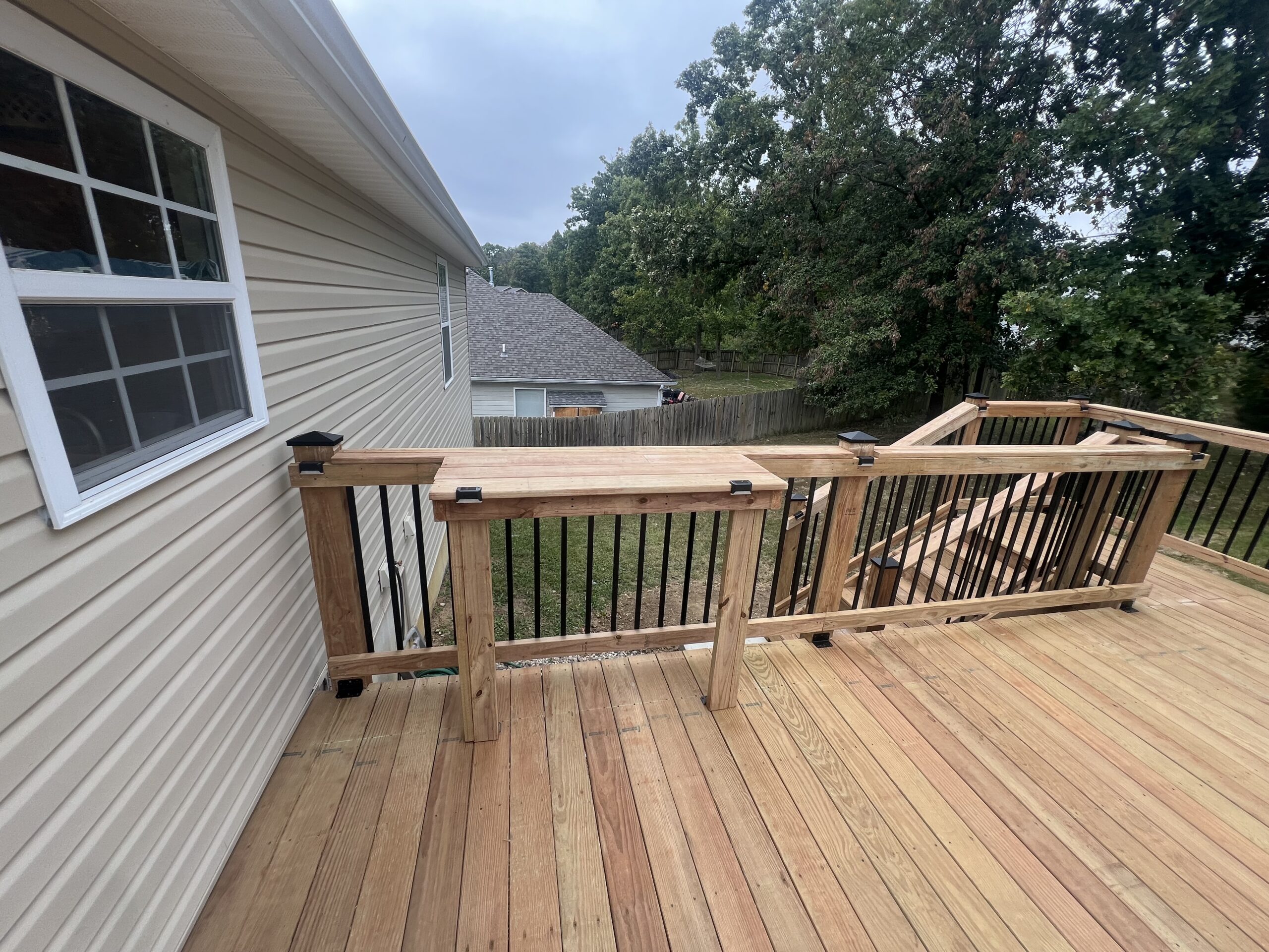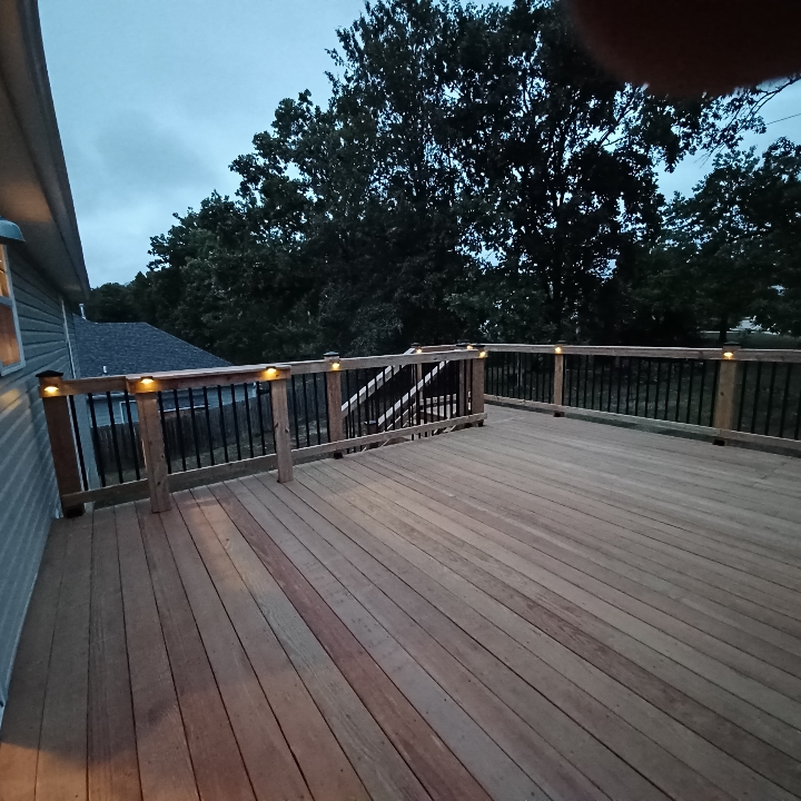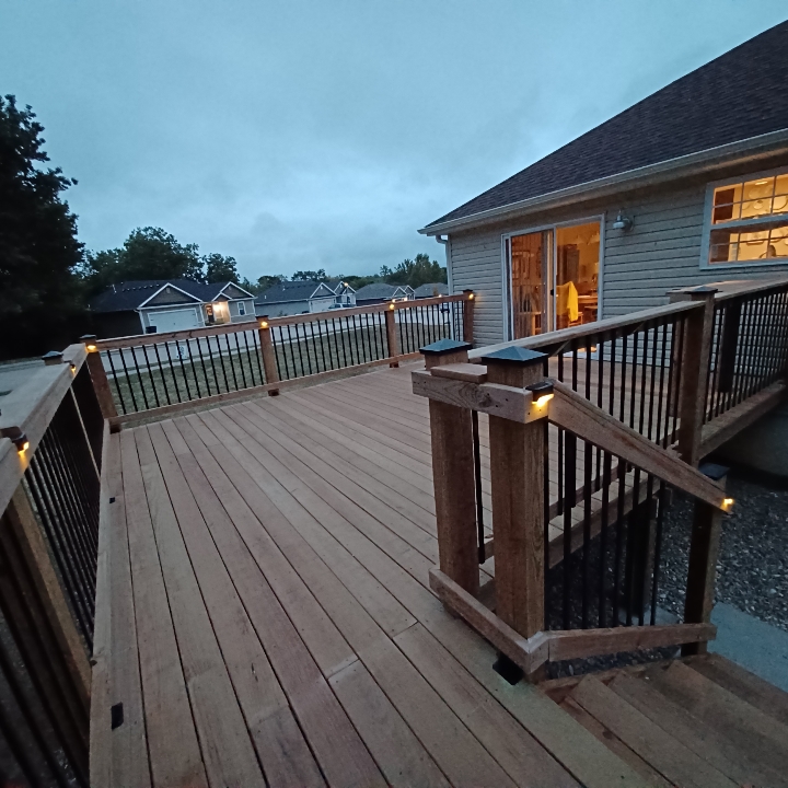 A large, spacious deck was constructed with careful attention to both functionality and aesthetics. Integrated lighting ensures the area remains well-illuminated at night, providing safety and ambiance for evening gatherings. The design offers ample room for outdoor furniture and activities, making it an ideal space for relaxation or entertaining guests.